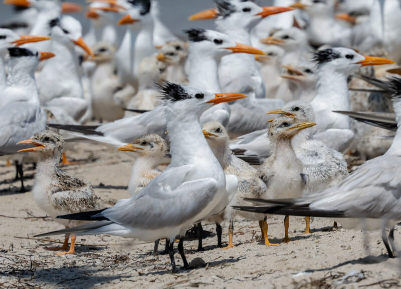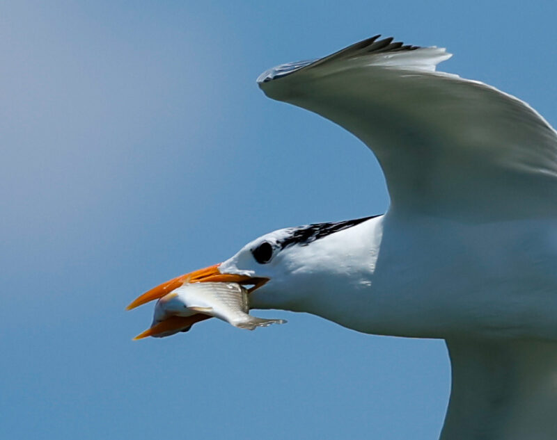 The royal tern is the most abundant large tern throughout the mid-Atlantic region. Seen loafing on pilings and docks throughout the Chesapeake Bay during migration, royals use a relatively small set of sites for nesting. Nesting sites are typically sandy islands that lack ground predators and are in close proximity to productive waters with large numbers of forage fish.