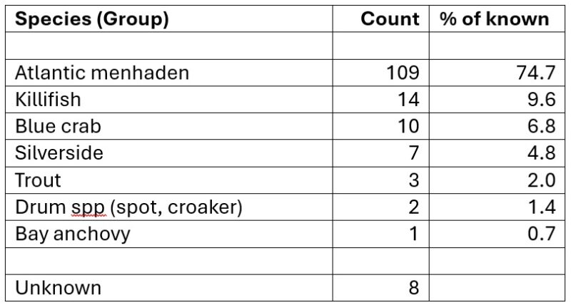 In a very short period, I was able to record a sample (N = 154) of individual prey carried to the colony by adults. Most (95%) of the prey could be identified using the photos. Several prey groups were identified in the sample including speckled trout, killifish, silversides, spot/croaker and soft-shelled blue crabs. The most abundant (74.7%) prey was Atlantic menhaden.
