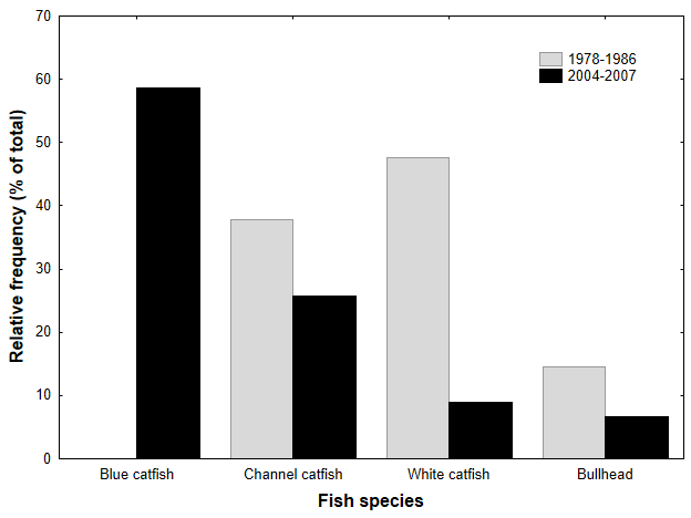 The use of native vs invasive catfish by bald eagles has changed over time. Between 1978 and 1986, the National Wildlife Federation’s Raptor Information Center supported a banding crew that attempted to band all eaglets produced in the Chesapeake Bay region. In addition to banding young the team recorded prey found in nests. During this period the native white catfish was the dominant catfish species found representing 47.6% and bullheads accounted for 14.6%. The majority (62.2%) of catfish used were native. Channel catfish accounted for 37.8% and no blue catfish were recorded.